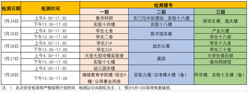 为了尽可能降低因楼内检测对师生学习和休息产生影响,检测单位制定了进场检测作业时间表,特告知,同时请各楼宇管理者做好相应的配合工作。