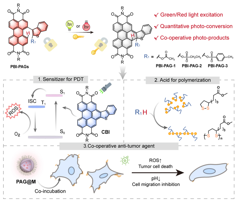 光酸染料(Photoacid Generator Dyes, PAG)作为光控pH调节及质子释放的关键分子工具,已广泛应用于电子化学品(如光刻胶)等高端制造领域。近年来,以光酸染料为工具的多学科研究(如智能材料、生物医药等)逐步兴起,突破了光酸染料的传统应用边界。然而,现有的光酸染料(PAG)在多学科交叉应用过程中存在一定的局限性:一方面,商品化的PAG分子激发波长集中在紫外或深蓝光区域,严重阻碍了其在多领域的应用研究范围(特别是生物医药领域);另一方面,传统光酸染料功能单一,往往只注重酸的释放,而其互补分子单元往往被认为是反应过程的“废弃物”,原子利用率低下。
