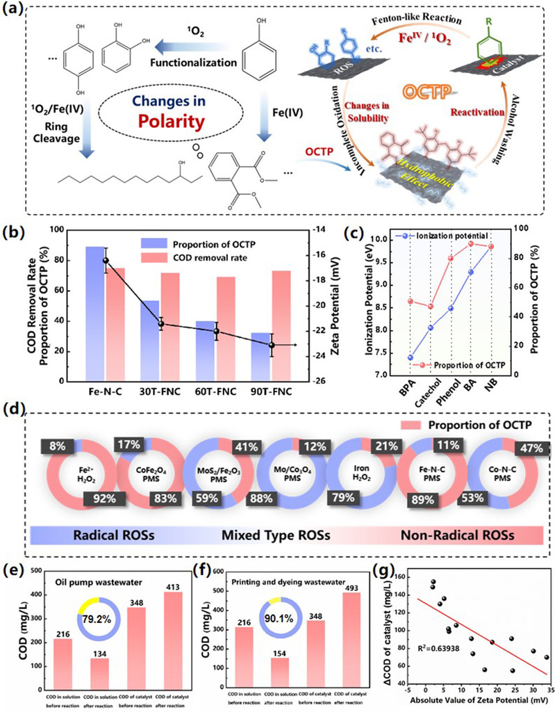 图1:(a) 基于疏水效应的OCTP;(b) OCTP与催化剂表面极性的对应关系;(c) OCTP与有机物IP值的对应关系;(d) 不同AOPs体系中的OCTP;(e) 油泵废水和 (f) 印染废水处理过程中的OCTP;(g) OCTP与Zeta电位绝对值的关系