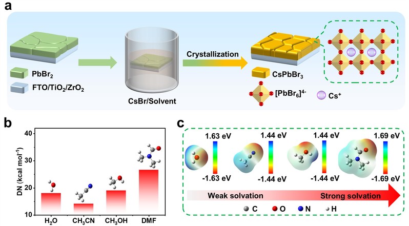 在传统的全无机CsPbBr₃钙钛矿太阳能电池的两步法合成工艺中,水相处理步骤在性能优化和长期稳定性提升方面已逐渐暴露出其局限性。为进一步提升全无机CsPbBr₃钙钛矿太阳能电池的光电性能,武文俊教授课题组创新提出了一种双溶剂工程策略。这一策略以密度泛函理论(DFT)计算和丁达尔效应分析为依托,精选出兼具高供体数与介电常数的溶剂,巧妙调节CsPbBr₃的表面Br/Pb比,成功诱导钙钛矿向p型转变,同时大幅抑制薄膜内部缺陷的产生。这些优化协同作用显著延长了载流子寿命、降低了缺陷密度,并提升了电荷传输效率。