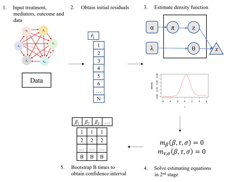 具体来说,VB-RobM 方法包括以下五个步骤:(1)输入数据并指定变量之间的路径;(2)利用回归分析获得每条路径的路径系数和回归残差的初始估计;(3)通过狄利克雷过程混合模型(DPMM)估计残差的密度函数以及稳健函数的一阶矩和二阶矩;(4)求解鲁棒估计方程获得路径系数的二阶段估计;(5)通过自助抽样法对中介效应进行统计推断。