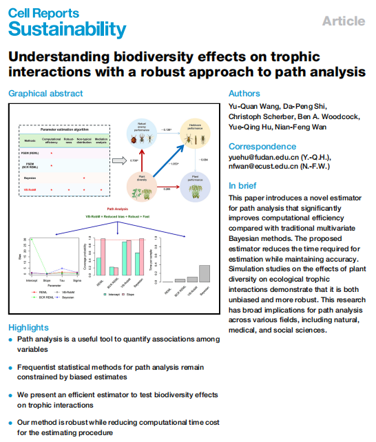 近日,药学院万年峰课题组,联合我国、英国、德国的科研人员,在Cell新子刊—Cell Reports Sustainability上以Articles形式发表了题为“Understanding biodiversity effects on trophic interactions with a robustapproach to path analysis”的原始创新研究成果。
