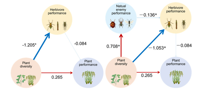 图3:VB-RobM解析植物多样性可通过增强天敌、抑制植食性昆虫促进植物生产力的路径机制