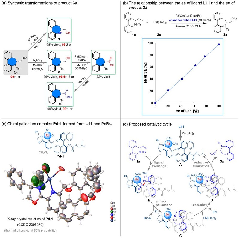 近日,我校化学与分子工程学院费林加诺贝尔奖科学家联合研究中心张志鹏教授/岑守义老师团队与南开大学彭谦教授合作,在新型原创性手性催化剂的设计发展和应用研究方面取得新进展,相关工作以“Enhanced Pyridine-Oxazoline Ligand-Enabled Pd(II)-Catalyzed Aminoacetoxylation of Alkenes for the Asymmetric Synthesis of Biaryl-Bridged 7-Membered N-Heterocycles and Atropisomers”为题发表于Journal of the American Chemical Society。