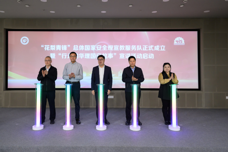 在“花梨青锋”总体国家安全观宣教服务队成立暨“行走的华理国安故事”宣讲活动启动环节,市教委后保处副处长黄峰,团市委学校工作部副部长周薇,校党委副书记沈海涛,党委宣传部部长柴华等共同为“花梨青锋”总体国家安全观宣教服务队成立和“行走的华理国安故事”宣讲启动。