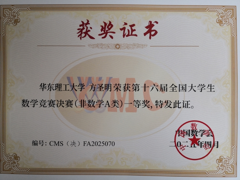 第十六届全国大学生数学竞赛决赛于4月13日在浙江师范大学落下帷幕。我校机动学院23级本科生方圣明荣获非数学A类全国一等奖。