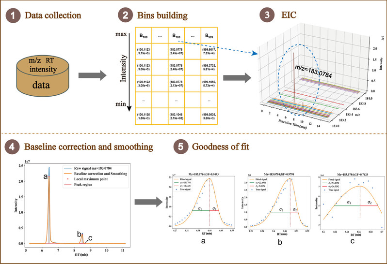 针对液相色谱-质谱技术(LC-MS)数据预处理中的特征提取难题,吴婷课题组创新性地提出局部非对称高斯拟合算法(LAGF)。该算法采用“1 Da数据点分箱”式EIC提取方法,显著提升了特征检测效率,简化了参数调整,降低了峰检测的假阳性,有利于批量代谢组学研究和环境污染物筛查分析。LAGF算法通过自动确定峰中心位点(μ)和峰高(α),同时自适应调整两侧标准偏差(σ1和σ2)来确定色谱峰型,最小化广义双侧非对称高斯拟合的参数数量。相比XCMS、Mzmine等传统工具,该算法在多数情况下展现出更高的特征提取准确性。LAGF算法同时以开源Python代码和交互界面两种形式提供,可便捷地应用于非靶向和靶向LC-MS分析,提升峰检测和化合物鉴定性能。相关研究成果以“Local Asymmetric Gaussian Fitting Algorithm forEnhanced Peak Detection of Liquid Chromatography–High Resolution MassSpectrometry Data”为题发表在分析化学领域权威期刊Analytical Chemistry上。化学学院硕士生邹盛斯为论文第一作者,吴婷和杜一平为论文通讯作者。