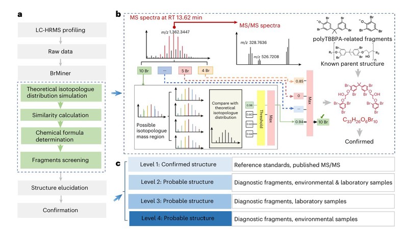 作为传统卤系阻燃剂的“安全”替代品,聚合物阻燃剂已在日常生活和工业生产中得到广泛应用。然而,现有研究尚未系统揭示其环境归趋和毒性效应,相关潜在风险仍存在重大认知空白。针对这一问题,课题组自主研发了基于高分辨质谱数据的溴代污染物非靶向筛查工具BrMiner,在华南典型电子垃圾回收场的环境样品中成功鉴定出76种聚合物阻燃剂的降解产物。课题组与暨南大学陈达教授和南京大学张效伟教授合作,利用拟降解实验和斑马鱼胚胎毒性测试,证实了聚合物阻燃剂在环境降解过程中会产生更高毒性的转化产物,为完善阻燃剂环境风险评估体系提供了重要依据。研究成果以“Environmental impacts of polymeric flame retardantbreakdown”为题发表在Nature Sustainability上。化学学院已毕业博士研究生熊訚然为论文共同第一作者,吴婷为论文共同通讯作者。