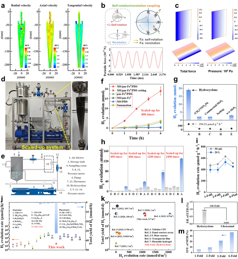 邢明阳教授团队与付鹏波副教授团队在前期废水产氢相关研究(PNAS,2023,120,e2218813120)的合作基础上,通过批量合成MoS2压电催化剂,并引入商品化微米铁粉(μm-Fe0)作为无机助催化剂以及过硫酸钾(PDS)作为热力学助剂,成功构建了拓展型高级氧化耦合压电催化体系(batch-MS/μm-Fe0/PDS),并将该体系应用于压电催化海水制氢资源化过程。之后,研究团队进一步将水力旋流器与该催化体系结合,率先构建了水力旋流激发的规模化(20L)压电催化海水制氢系统,该系统达到了0.73L/h的产氢速率。该研究还报道了规模化压电催化过程中的宏观能量利用率:该体系中水的机械能转换成氢能的效率达到了36.82%,电能转化为氢能的效率为传统超声波清洗机的140倍以上。此外,研究团队依据压降数值,计算出水力旋流器生产1Nm³H₂的理论能耗仅为5.78kWh,这一数值与工业电解水制氢技术的能耗(约5kWh)十分相近,证实了该技术在实际应用层面的可行性。在对催化体系进行从50mL到20L的规模化放大实验过程中,该体系成功保持了80%以上的催化活性,率先实现了水力激发的规模化压电海水制氢,为推进压电催化的工程化应用提供了重要参考。值得一提的是,目前在实验室条件下被广泛采用的超声机压电催化反应系统存在能耗高、长时间反应过热、功率衰减快、无法等比例放大等缺点,相比之下,能耗更低的中小型旋流器有望取代超声机成为实验室以及未来产业化首选的压电催化产氢装备。