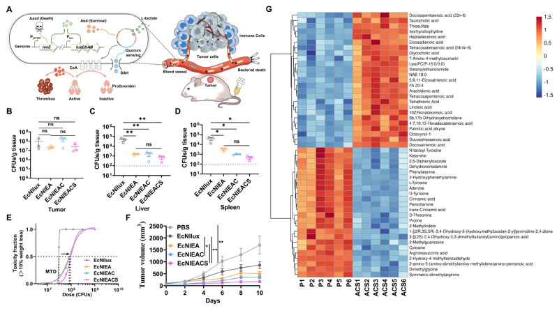 研究团队首先通过生物信息学筛选,开发了一种不受葡萄糖等肿瘤微环境抑制的新型乳酸调控元件和传感器,使工程菌能够精准响应肿瘤组织的乳酸浓度。随后耦合“感知-响应-繁殖”基因回路,使工程菌仅在肿瘤微环境中存活。工程菌组织脱靶降低2-3个数量级,最大耐受剂量提升3倍。进一步引入基于群体感应的α-溶血素自调控释放回路,以增强抗肿瘤效果。此外,由高水平乳酸诱导工程菌产生凝固酶(Coa)诱导了瘤内血栓形成。非靶向代谢组表明,血栓形成剥夺了肿瘤的营养和氧气供应,诱发肿瘤代谢重编程,协同提高了工程菌抗肿瘤效果。此外,瘤内栓塞减少了细菌和毒性蛋白泄漏的风险。这种自调控的工程活菌药物肿瘤抑制率达90%,显著延长了结直肠癌荷瘤小鼠的存活时间。总之,智能化基因线路赋能的活体疗法为肿瘤的精准高效治疗提供了新的工具。
