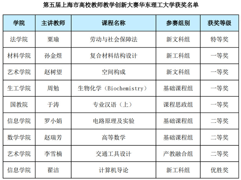 近日,第五届上海市高校教师教学创新大赛获奖名单公布(沪教委高﹝2025﹞22号),我校推荐的9位参赛教师喜获佳绩,共获得特等奖1项、一等奖4项、二等奖3项、优胜奖1项。学校继续蝉联“优秀组织奖”。