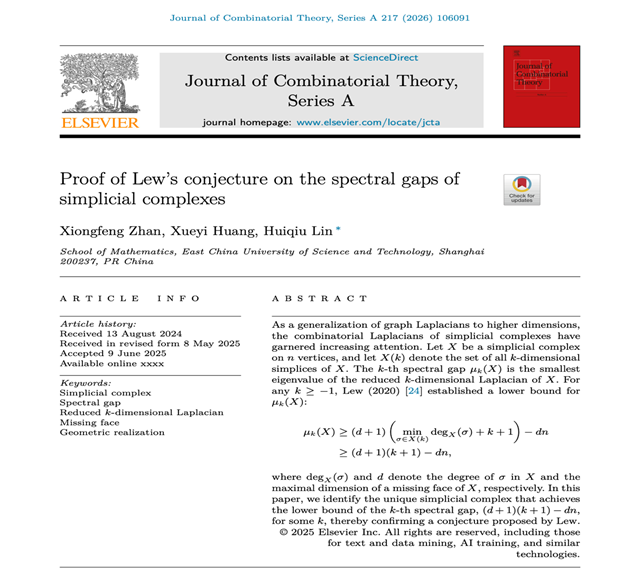 近日,我校数学学院林辉球教授团队在组合代数拓扑领域取得重要研究进展,其研究成果《Proof of Lew's conjecture on the spectral gaps of simplicial complexes》发表于组合数学领域权威期刊《Journal of Combinatorial Theory, Series A》(2026, Vol. 217)。该研究成功解决了美国卡内基梅隆大学著名学者Alan Lew于2020年提出的关于单纯复形谱隙下界的猜想。
