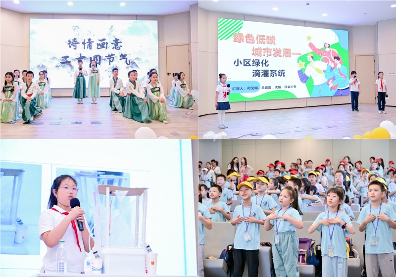 在“花栗讲堂”环节,华理附小四年级学生赖天晴带来了《AI 中国 “芯”》科技小报告;何艾闻等同学组成的小花栗观察团则带来了《小区绿化滴灌系统》实践活动介绍;华理附小四2 班学生带来的朗诵表演《节气诗韵》。最后,全场营员起立共跳《你笑起来真好看》韵律操,在欢快的氛围中正式开启夏令营科技探索的奇妙旅程。