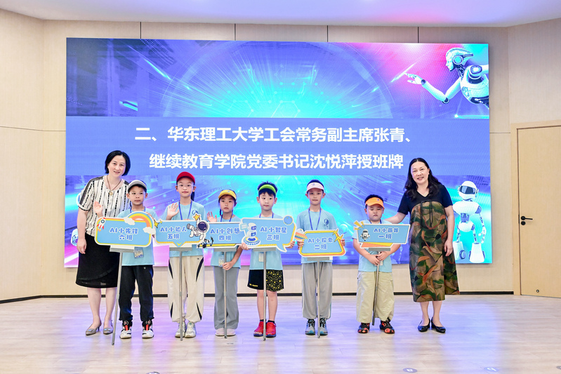 张青、沈悦萍为各班级代表授班牌,象征以科技探索为目标的“AI小萌芽班”“AI小先锋班”等六个班级正式启航。