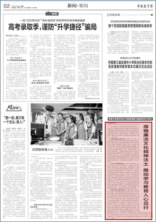 《中国教育报》刊发文章聚焦报道我校推进深入贯彻中央八项规定精神学习教育做法