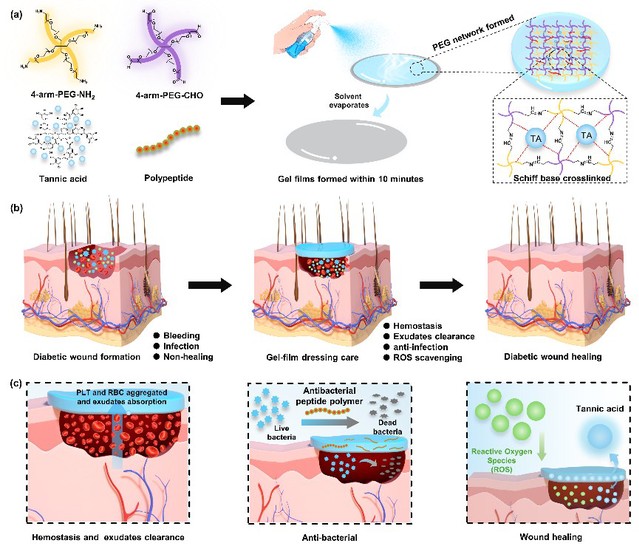 糖尿病创面常伴有微生物感染、活性氧(ROS)积累、出血和渗出液管理不善,导致其愈合困难。创面敷料具有治疗方案简单、可减轻患者疼痛和经济负担等优点被广泛用于临床治疗的研究,然而传统敷料不足以调节感染性糖尿病创面的复杂病理生理微环境,且临床使用过量抗生素会加剧细菌耐药性的发生,进一步增加治疗的难度。针对以上挑战,该研究通过使用广泛应用于组织工程领域的四臂聚乙二醇(4-arm-PEG)和单宁酸(TA)设计了一种可喷涂-蒸发制备的动态交联双网络结构水凝胶薄膜敷料,通过负载课题组前期开发的具有广谱高效抗菌活性和良好的生物安全性的β-氨基酸聚合物βLys50HG50,制备了具有高效抗菌活性、抗氧化、止血和渗出液清除能力的水凝胶薄膜敷料。在感染性糖尿病创面模型中,该敷料能有效清除创面中的活性氧积累和渗出液,并高效降低创面组织中的细菌负荷和提高创面愈合率,其治疗效果甚至优于临床治疗指南创面敷料Prontosan (B. Braun)。此外,该敷料在肝脏急性出血模型中实现15秒内快速止血,有效减少伤口出血量,优于临床使用的止血海绵Merocel (Medtronic),并在治疗完成后可按需在室温下无痛移除。该研究为促进感染性糖尿病创面的愈合和临床管理提供了一种极具潜力的治疗选择。