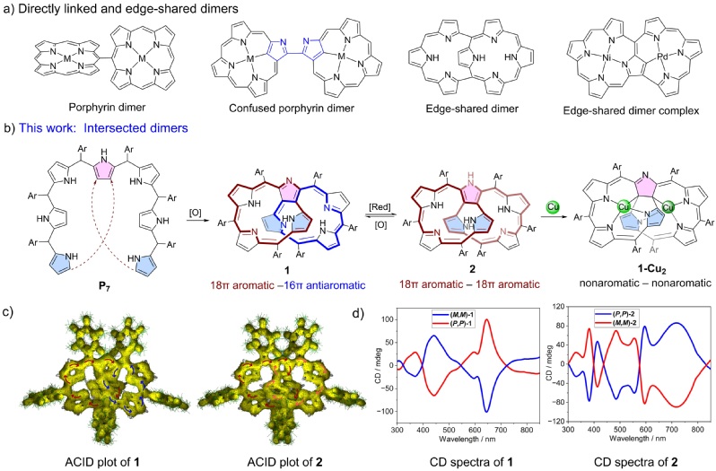 卟啉类大环分子具有突出光电性能,广泛存在于叶绿素、血红素等自然界功能体系,被誉为“生命色素”。通过改变卟啉大环母体结构得到的卟啉类似物异卟啉,往往具有更加丰富独特的结构与性能。而将两个异卟啉单元连接形成的二聚体 (图 a),则具有分子内能量/电子转移、双光子吸收和非线性光学等独特性能。其中,较为典型的边共享异卟啉二聚体为双空腔结构,具有潜在的多重共轭大环路径、电子转移、芳香性和双金属配位等性质 (图 a)。但传统方法合成的二聚体,其结构单元往往具有刚性平面结构,难以实现手性拓扑结构。