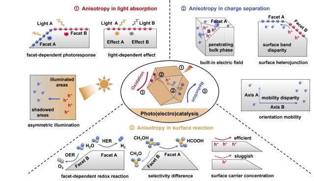 图2 光(电)催化中的各向异性机制示意图。各向异性单晶半导体相关的光催化氧化还原反应的示意图。①光吸收, ②载流子分离, ③表面氧化还原反应。