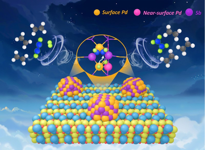 近日,我校催化反应工程团队段学志教授、曹约强特聘研究员基于吸附构型匹配策略在炔烃加氢催化剂创制方面取得新进展,构建兼具表面Pd1Sb2三原子位点与近表面Pd位点(Pdns)的PdSb金属间化合物催化剂,实现烃类吸附与氢气活化位点的空间解耦,突破了加氢反应活性与选择性平衡制约。相关研究成果以“Synergizing Pd1Sb2 Site with Neighbouring Near-Surface Pd Site to Break Trade-Off between Selectivity and Activity of Alkyne Semihydrogenation”为题在线发表于《美国化学会志》。