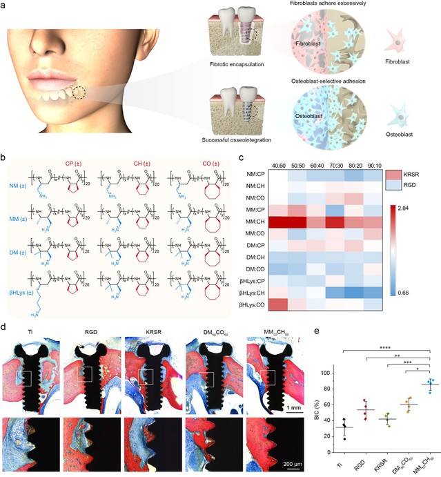 骨整合对于种植牙等永久性植入物发挥着至关重要的作用。这一过程主要取决于成骨细胞在植入物表面的初始黏附,这些细胞分泌的细胞外基质(ECM)对新骨的重塑和矿化至关重要。然而在植入过程中,异物反应引发的伤口愈合反应或由于患者个体差异导致局部组织愈合微环境遭到破坏时,成纤维细胞可能会被募集到植入物附近区域。这会导致纤维包膜的形成,抑制成骨细胞在植入物表面的定植,从而增加骨整合失败的可能性。目前大多数现有策略虽能促进成骨细胞黏附,但缺乏对成骨细胞和成纤维细胞的选择性。虽然 KRSR 肽可促进成骨细胞的选择性黏附,但其存在天然肽的常见缺点,如易被蛋白酶水解、大规模合成困难且成本高昂。因此,开发能够选择性促进成骨细胞黏附而非成纤维细胞黏附的生物材料和植入物涂层,对于改善骨整合至关重要。