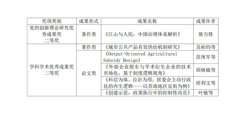 熊万胜撰写的《江山与人民:中国治理体系解析》获党的创新理论研究优秀成果奖著作类二等奖;吴柏钧等撰写的《城市公共产品有效供给机制研究》获学科学术优秀成果奖著作类二等奖;范体军等撰写的《Output-Oriented Agricultural Subsidy Design》获学科学术优秀成果奖论文类二等奖;邱姝敏等撰写的《外部企业股东与学术衍生企业的技术市场化:基于制度逻辑视角》获学科学术优秀成果奖论文类二等奖;侯利文等撰写的《科层为体、自治为用:居委会主动行政化的内生逻辑——以苏南地区宜街为例》获学科学术优秀成果奖论文类二等奖;叶敏等撰写的《创建示范:政策执行中的控制性动员》获学科学术优秀成果奖论文类二等奖。