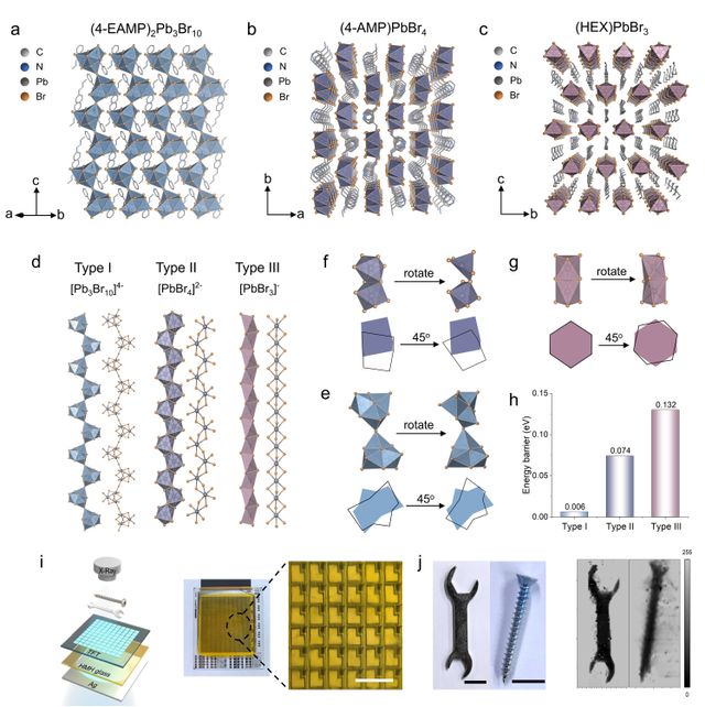 针对上述问题,研究团队设计合成了一系列具有不同无机链构型(角共享、边共享、面共享)的一维金属卤化物单晶材料,并系统讨论了不同构型对材料热学、力学性质的影响。值得注意的是,具有角共享无机链的4-乙氨甲基吡啶铅溴(4-EAMP)2Pb3Br10表现出类聚合物的柔性特征,这一性质为其熔融过程提供了构象自由度,使其能在70 K的宽温区间内稳定熔融,并通过快速淬冷工艺实现大面积(直径~6.5 cm)非晶玻璃的制备。非晶化的玻璃网络结构阻碍了分子内离子的迁移路径,显著提高了材料的运行稳定性;同时,优异的熔融加工性使得该材料能轻易实现与薄膜晶体管(TFT)阵列的集成。最终,基于非晶(4-EAMP)2Pb3Br10玻璃的X射线探测器实现了高达8581.7μC Gyair-1cm-2的灵敏度和在低剂量率下的多像素快速成像。上述工作为探索新型X射线探测材料、理解有机-无机杂化固体中熔融和玻璃化的起源及其结构表现提供了新的思路。