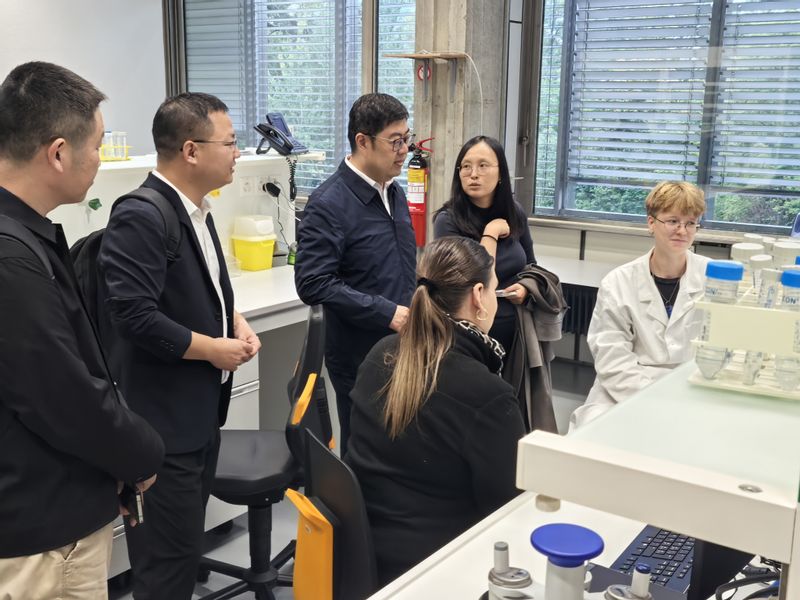 访问日内瓦大学期间,沈海涛一行与瑞士化学会分析科学主席、该校化学生物部副主任Eric Bakker教授会谈。沈海涛介绍学校化学化工领域学科进展,Bakker介绍电化学分析领域成果。双方商定共同申报项目,开展青年师生互访。代表团还看望该校终身副教授曹婵校友,并参观实验室。