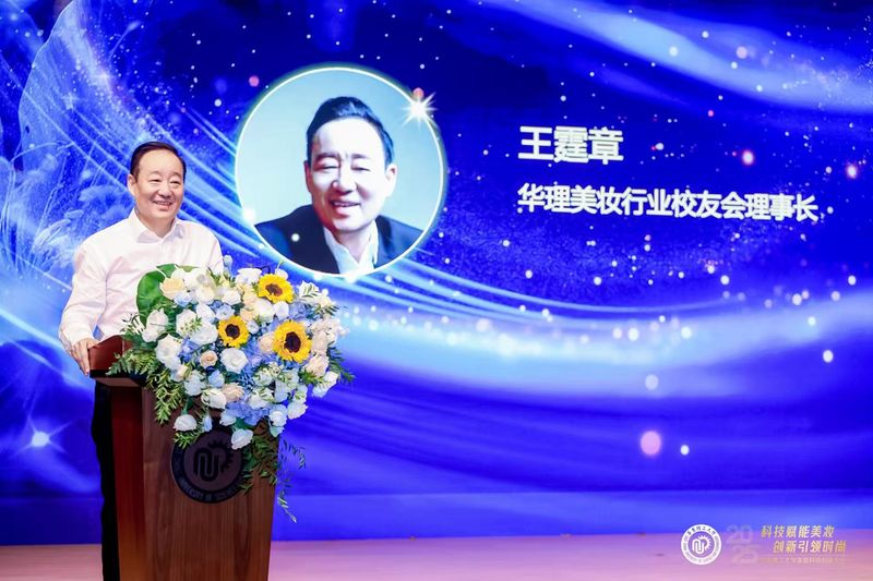 王霆章在发言中回顾校友会在汇聚校友力量、服务学科建设、推动产业进步方面所做的努力。他呼吁广大校友积极支持母校发展,共建联合实验室、设立奖学金、提供实习基地,推动美妆行业创新生态的持续繁荣。