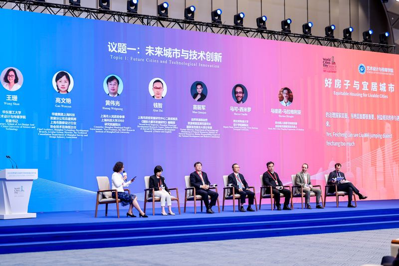 三场圆桌论坛从“未来城市与技术创新”“好房子与高品质生活”“完整社区与有机更新”三个议题展开深度对话。来自政府部门、国际机构、学术界和产业界的嘉宾围绕城市的可持续性与人居幸福感展开跨界讨论,探索全球视野下“人民城市”的落地方案。第一场论坛由我校发起,聚焦“未来城市与技术创新”主题。艺术设计与传媒学院党委书记王珊主持,自然资源部自然资源调查监测司原司长苗前军、上海市政府发展研究中心二级巡视员钱智、上海市人民政府参事,上海科技大学2060研究院副院长黄伟光、华建集团上海科技发展分公司总建筑师高文艳、西交利物浦大学设计学院副院长马可·西米罗、联合国人居署可持续发展目标城市(SDG Cities)旗舰项目负责人马提诺·马拉格利亚展开对话,聚焦AI与绿色技术在城市规划中的应用。