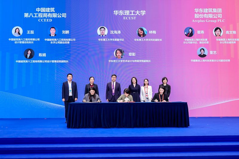 会议最后,艺术设计与传媒学院副院长章彰、中国建筑第八工程局有限公司设计管理总院副院长陈娟、华建集团上海科技发展分公司副总经理董艺签署产学研合作协议,沈海涛副书记、校文科处副处长林梅等领导见证签约,标志着三方在人才培养与技术转化领域的深度合作迈上新台阶。