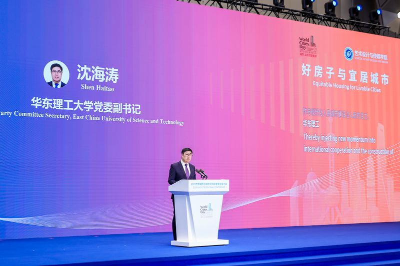 当天下午,我校与中国建筑第八工程局有限公司、华东建筑集团股份有限公司联合主办的2025世界城市日城市可持续发展全球大会“好房子与宜居城市”主题会议在世界会客厅星空厅成功举办。上海市人民政府副秘书长王为人、石垣和子、黄国吉、吴志城、韦东、沈立东、齐朋、奈斯等出席本次会议。300余位来自联合国人居署、上海市政府、科研院所及国内外城市代表的专家学者齐聚黄浦江畔,共话住房公平与城市宜居。校党委副书记沈海涛出席会议并致辞,中国科学院院士、校党委常委、副校长朱为宏出席会议并做主旨演讲,会议由艺术设计与传媒学院院长汪军主持。
