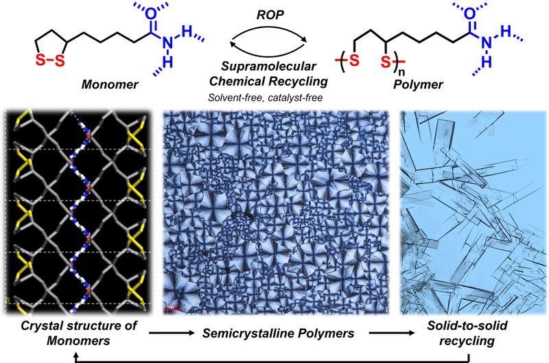 现代社会的可持续发展目标要求经典高分子材料从传统的线性工业模式向循环生产模式转变。开发可闭环化学回收的新型高分子材料为实现未来塑料循环经济提供理想的化学解决方案。当前的可闭环化学回收高分子设计思路主要聚焦于分子工程策略,例如通过取代基效应精细调控环状单体分子的环张力,以设计兼具聚合性和解聚性的“近平衡聚合物”(ΔGp ~ 0)。然而,这一策略在本质上需要牺牲聚合性以提升解聚性,在单一封闭体系中难以突破热力学的焓熵补偿原则限制,解聚过程往往需要溶剂或热量作为熵驱动力以实现高效解聚,这使现有高分子的闭环化学回收工艺往往伴随着较高的碳排放(溶剂、分离、加热等)。如何突破现有化学回收技术的局限性、开发低碳、无溶剂、甚至无催化剂的聚合物到单体的回收技术仍然是一个开放式挑战。